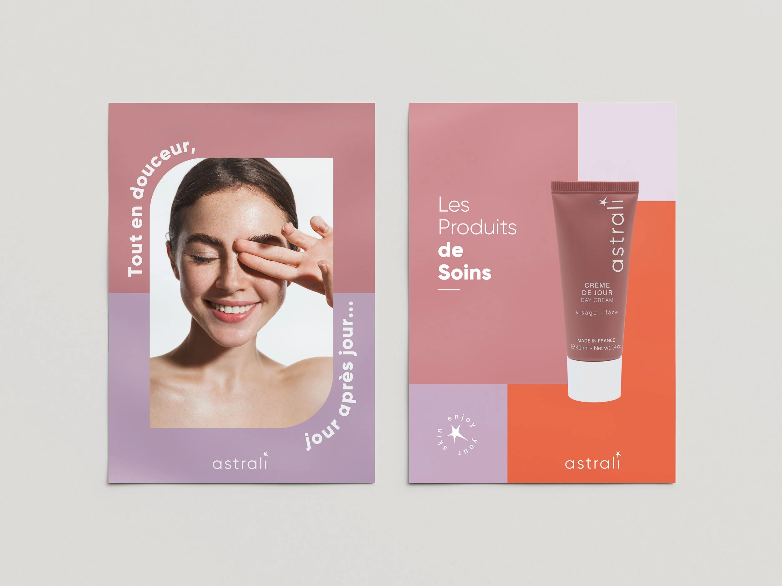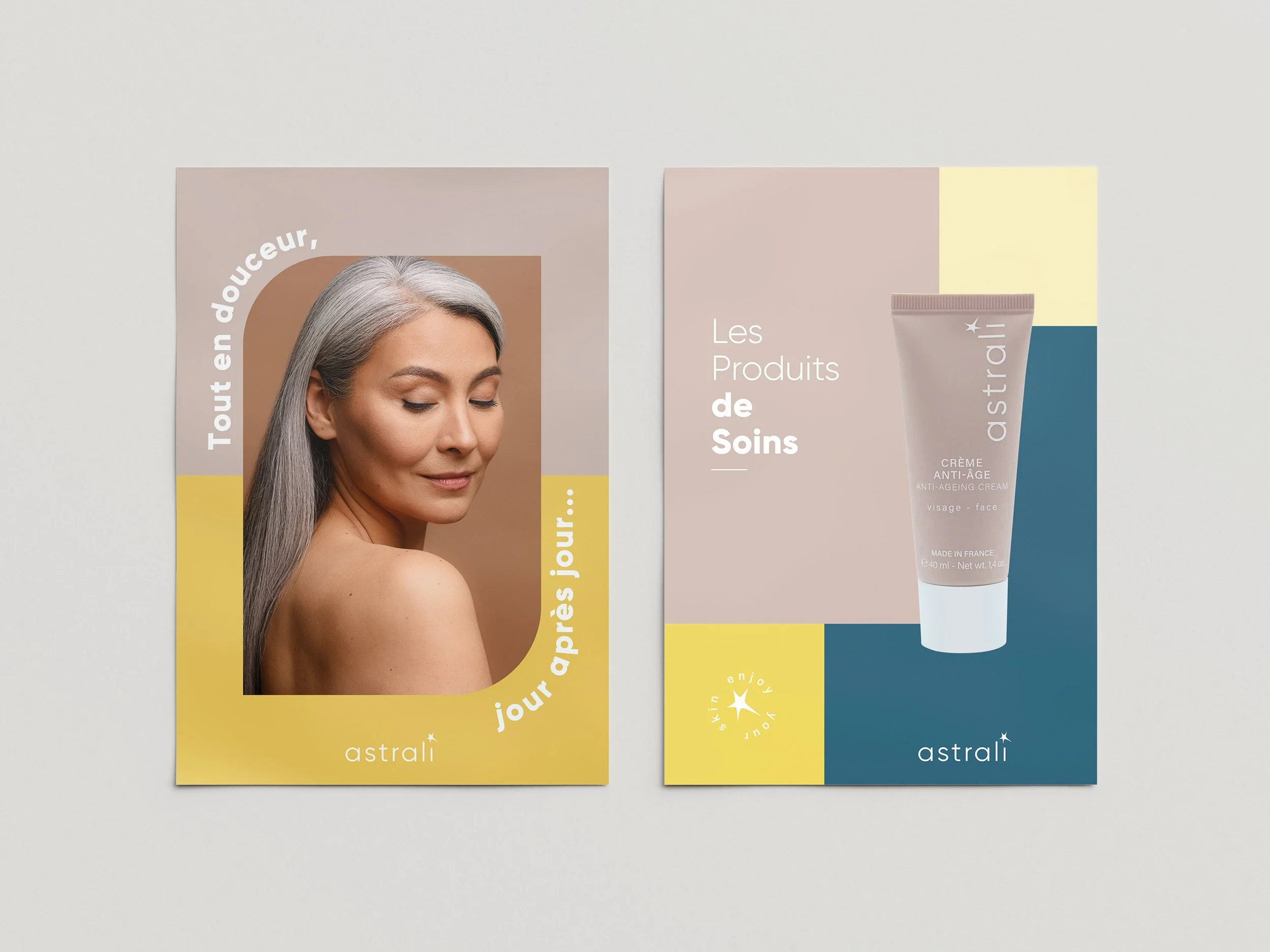 Avec Astrali, mon intention était de prouver que le soin de qualité peut être abordé avec légèreté et clarté. En simplifiant les codes graphiques, j'ai voulu rendre la marque immédiatement lisible et désirable, en mettant l'accent sur la complicité plutôt que sur la démonstration scientifique.